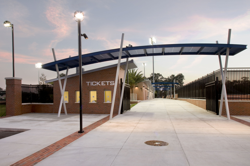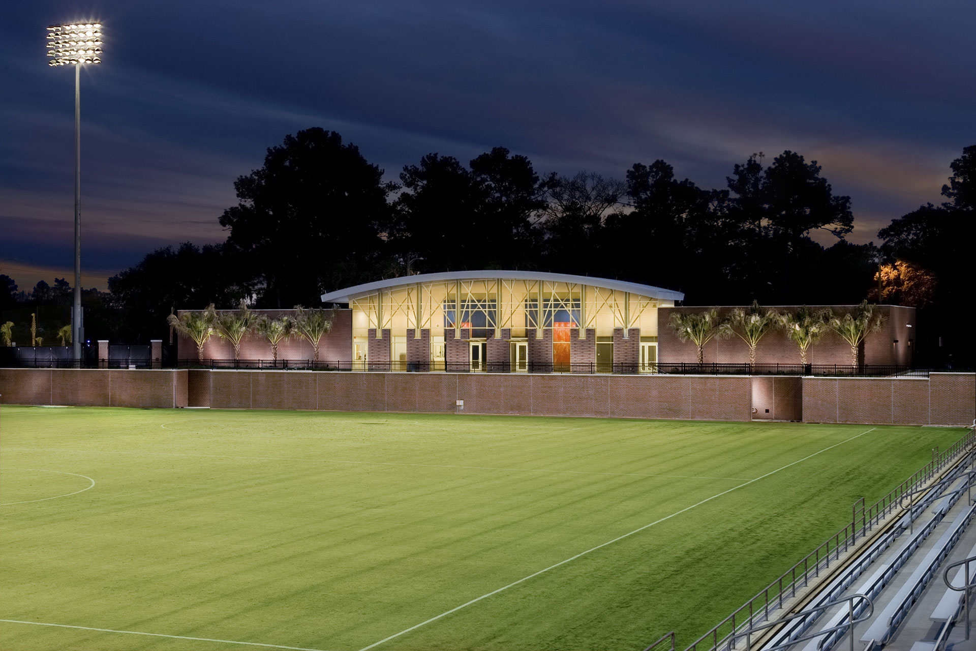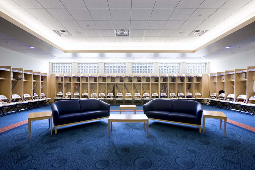 This project consisted of the new construction of two practice fields, one for soccer and one for lacrosse, one competition field fully lit for lacrosse, grandstand capacity seating for 1,000 to 1,500 with press box, restrooms and concessions stand. Also included in the project scope was a building which includes locker rooms for two teams and meeting rooms. This facility is LEED Gold Certified.
