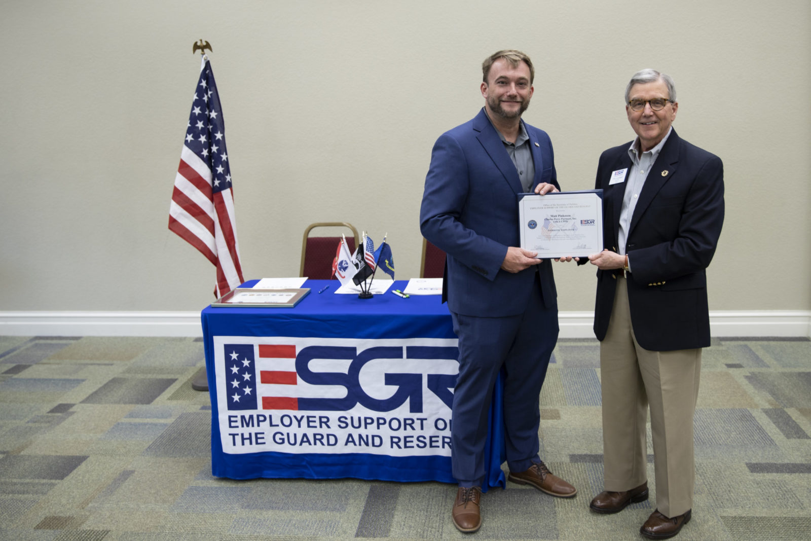 Also at the ceremony, Matt Pinkoson, CPPI’s VP/Regional Manager of North Central Florida, was presented a Patriot Award, by Tim Lambert of DoD ESGR, in recognition of his tremendous support of his employee, Mississippi Army National Guard Captain Donald Drummond.